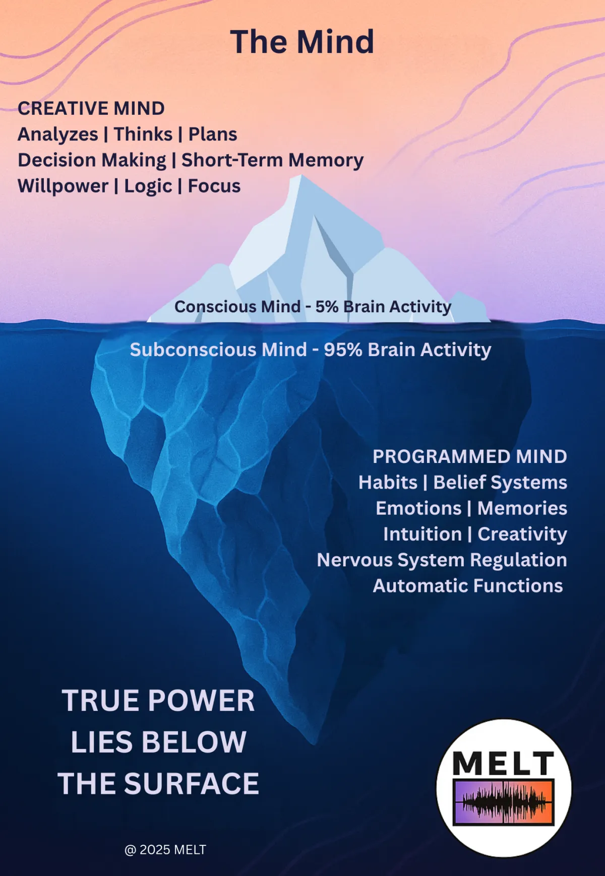 How much of our suffering comes from the subconscious programs of the past—patterns and habits learned in childhood, belief systems that may not even be our own, and painful experiences we’ve carried forward without realizing it? While our conscious mind helps us analyze, plan, and make decisions, it accounts for only about 5% of brain activity. The other 95%—our subconscious mind—holds the real power. It stores our emotions, memories, and automatic behaviors, shaping how we respond to life often without us even being aware of it. As Bruce Lipton and Joe Dispenza teach, true transformation happens when we access this deeper level of the mind, shifting the subconscious patterns that silently govern our lives. Awareness is only the first step—lasting change comes when we reprogram the subconscious, where our true potential lies beneath the surface.